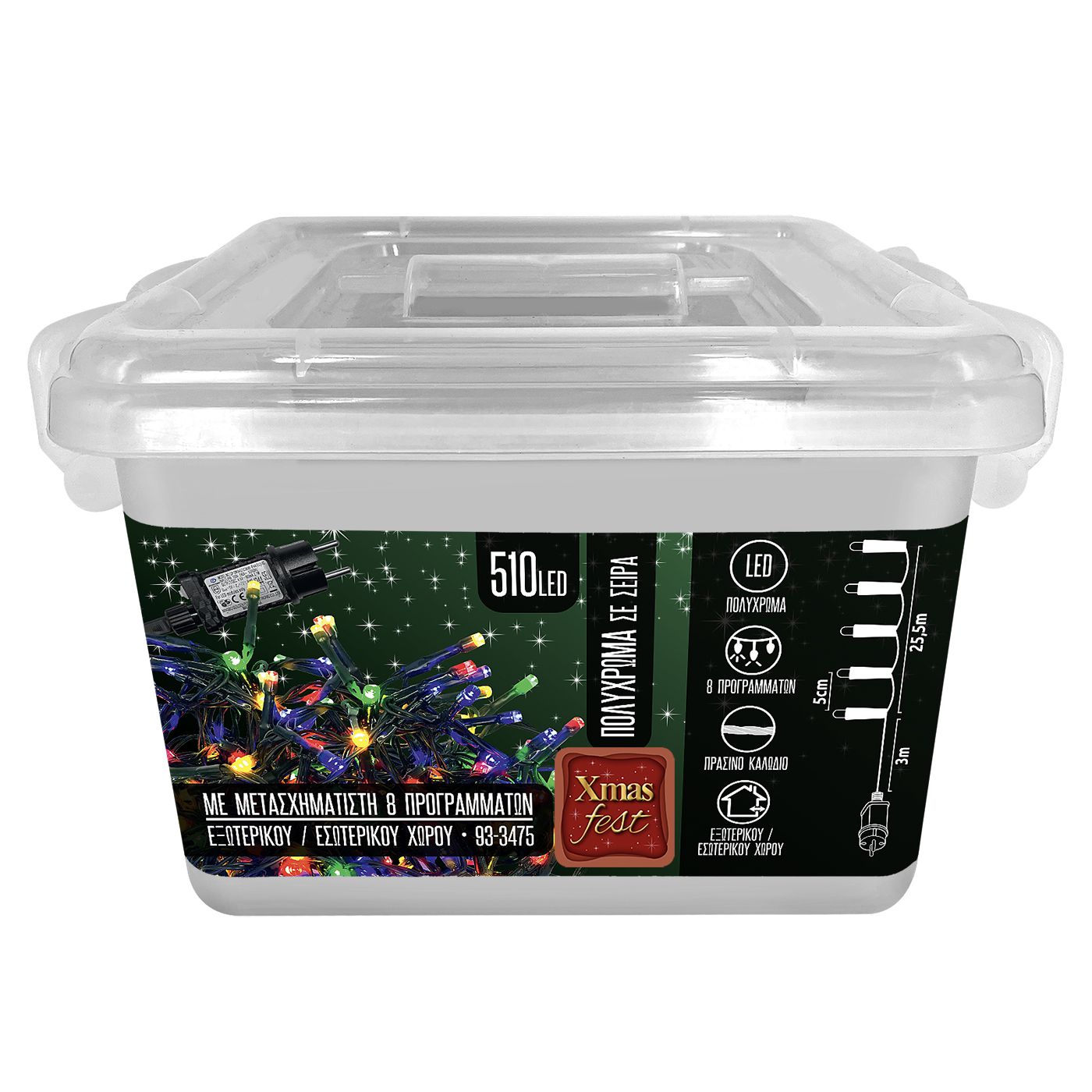 510 LED πολύχρωμα με controller 8 προγραμμάτων. Για εξωτερικό & εσωτερικό χώρο. Με πράσινο καλώδιο. Περιέχεται ο μετασχηματιστής IP44 28,5m