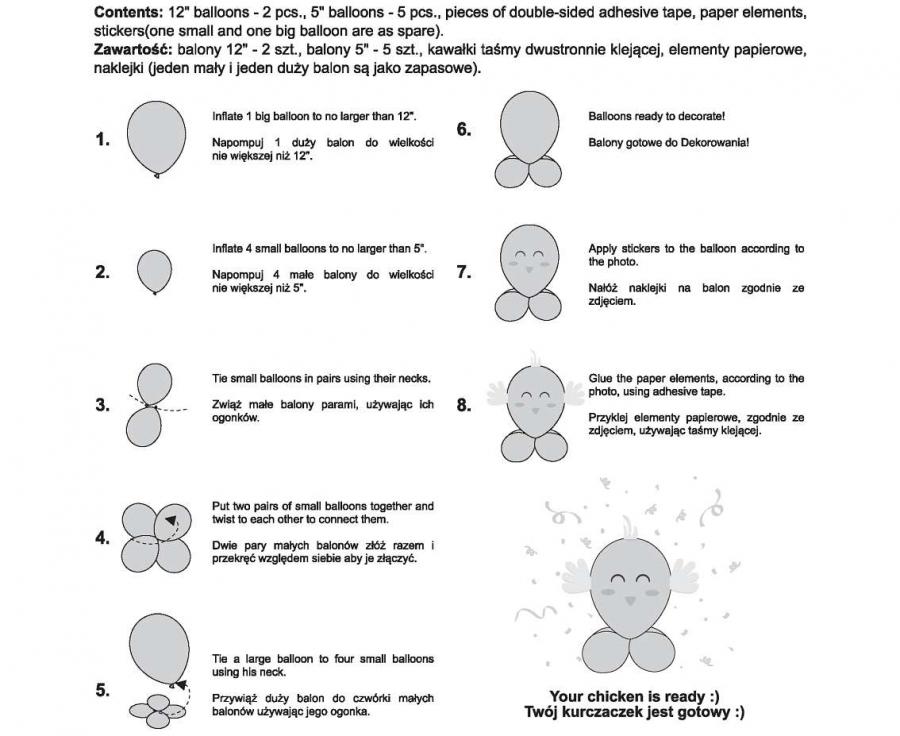 Το σετ αποτελείται από μικρά και μεγάλα μπαλόνια καθώς και ταινίες διπλής όψης ώστε να κατασκευάσετε το κοτοπουλάκι που απεικονίζεται